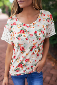 Adorable short sleeve baseball tee with blush bodice & floral print sleeves. Made to have a relaxed fit, the model is shown wearing a small. Made of rayon/spandex fabric. Hand wash cold- line dry.