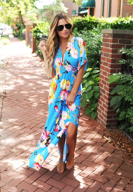 Brighten up your summer style with this beautiful maxi! Bright blue floral print maxi dress with kimono sleeves, V neckline, and smocked elastic waistline. Side slits & o[pen back detail with tie back closure. Unlined, not sheer. Fits true to size, the model is shown wearing a small. Made of rayon fabric. Hand wash in cold water- dry flat.