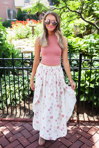 Beautiful cream/pink floral print maxi skirt with front button detail, front slit, ruffle hem detail, and side zipper closure. Unlined, not sheer. Fits true to size, the model is shown wearing a small. Made of rayon fabric. Hand wash- dry flat. Looks adorable as a set with our Cream/Pink Floral Off The Shoulder Top!