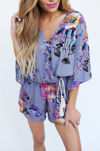 Online exclusive! Pink floral print chiffon romper with wrap front neckline, side pockets, and open back with strappy detail. Back zipper closure. Fully lined. Fits true to size, the model is shown wearing a small. Made of poly fabric. Hand wash- hang dry. Dry clean for best result.