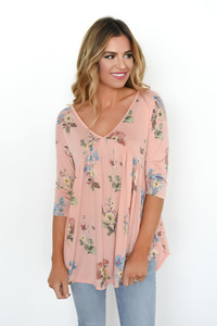 Adorable pink floral print tank with strap front neckline detail, spaghetti straps, and open back with T strap detail. Fits true to size, the model is shown wearing a small. Made of light-weight poly fabric. Hand wash- dry flat.