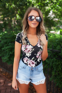 Bodysuits are trending for summer! Check out this casual black t-shirt bodysuit with short sleeves & bottom snap closure. Fits true to size, the model is shown wearing a small. Made of light-weight cotton/rayon/spandex fabric. Hand wash- dry flat in shade.