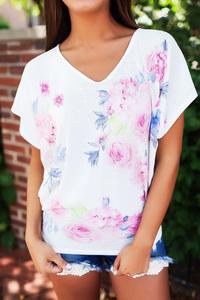 Super cute waffle knit top with short sleeves, V neckline, and curved hemline. Fits true to size, the model is shown wearing a small. Made of poly/rayon/spandex fabric. Hand wash- hang dry. Do not iron.